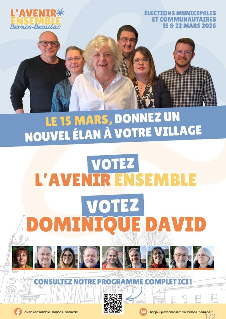 Notre liste, L’Avenir Ensemble, incarne l’énergie et la diversité de Bernos-Beaulac. Nous sommes des Beaulacaises et des Beaulacais — anciens élus, présidents d’associations, bénévoles, anciens fonctionnaires territoriaux, actifs — unis par une même passion : l’engagement au service de l’intérêt général et du bien-être de tous. Que nous soyons nés ici ou récemment installés, nous partageons une conviction : notre village mérite de renaître, de se rassembler et de rayonner. Ensemble, nous apportons des compétences complémentaires, des réseaux solides et une expérience variée pour faire de Bernos-Beaulac un village dynamique, attractif et solidaire, où chacun trouve sa place à chaque étape de sa vie.